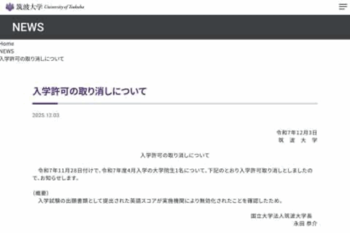 In connection with the mass cheating scandal surrounding the English proficiency test TOEIC, the University of Tsukuba in Ibaraki Prefecture, announced by December 4 that it had revoked the admission of one postgraduate student who had enrolled in April this year. The decision was made on November 28.