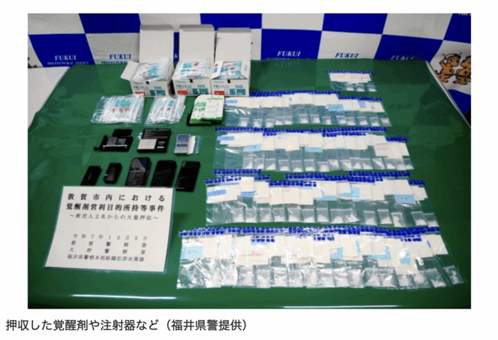 Four individuals, including a South Korean man in his 50s and three Japanese, were arrested by police in Fukui Prefecture for possessing and using stimulants. Approximately 135 grams of stimulants were seized – the largest amount in a case investigated solely by the prefectural police since 1989.